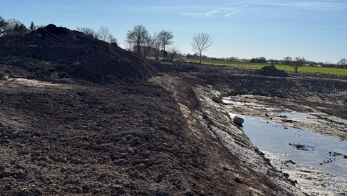 Henover påsken er der blevet gravet ud til søen, så nu rummer de 6 hektar af kirkens jord også en sø! Regnvandet vil langsomt fylde den, og lerjorden holder den tæt.