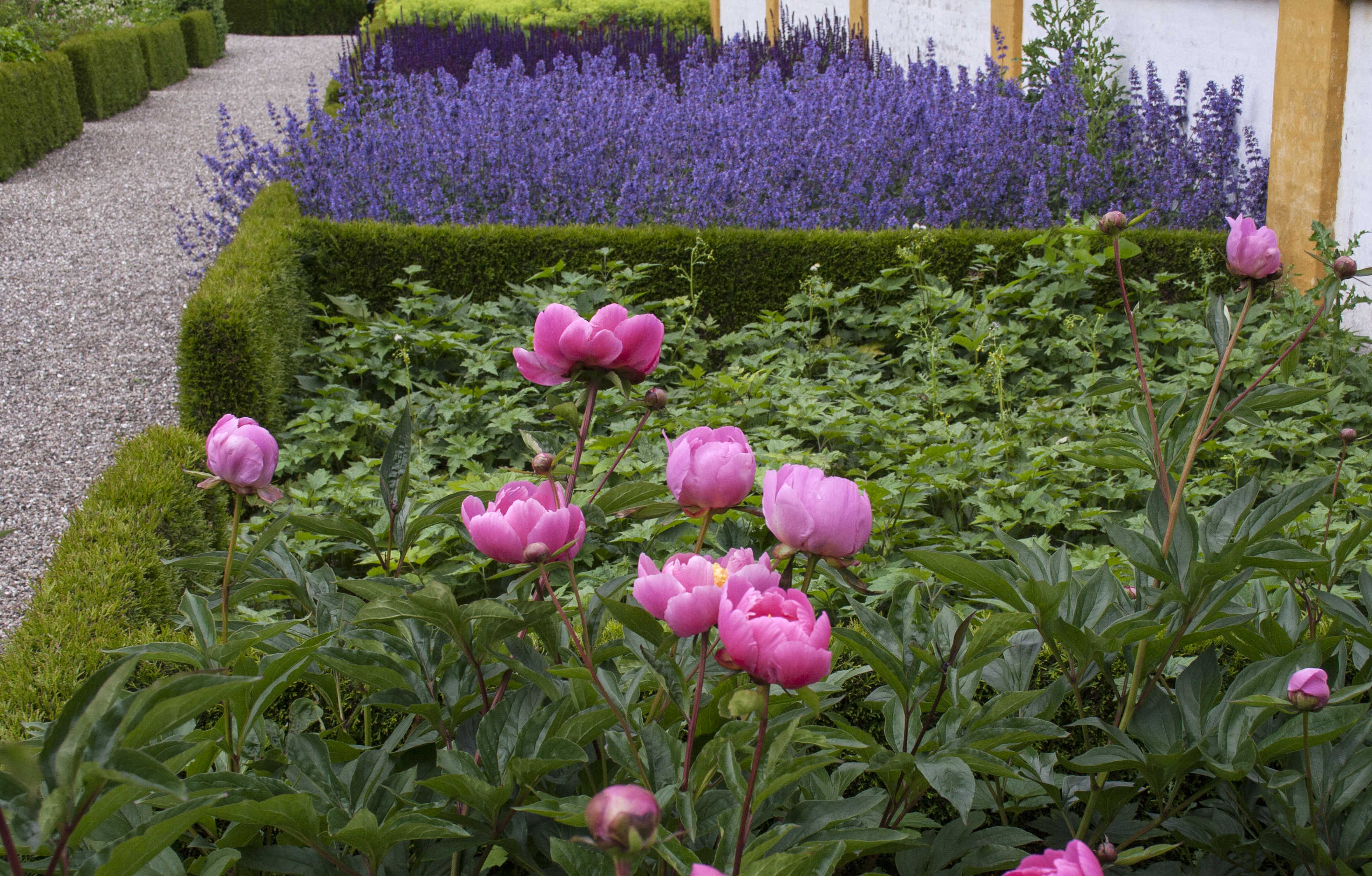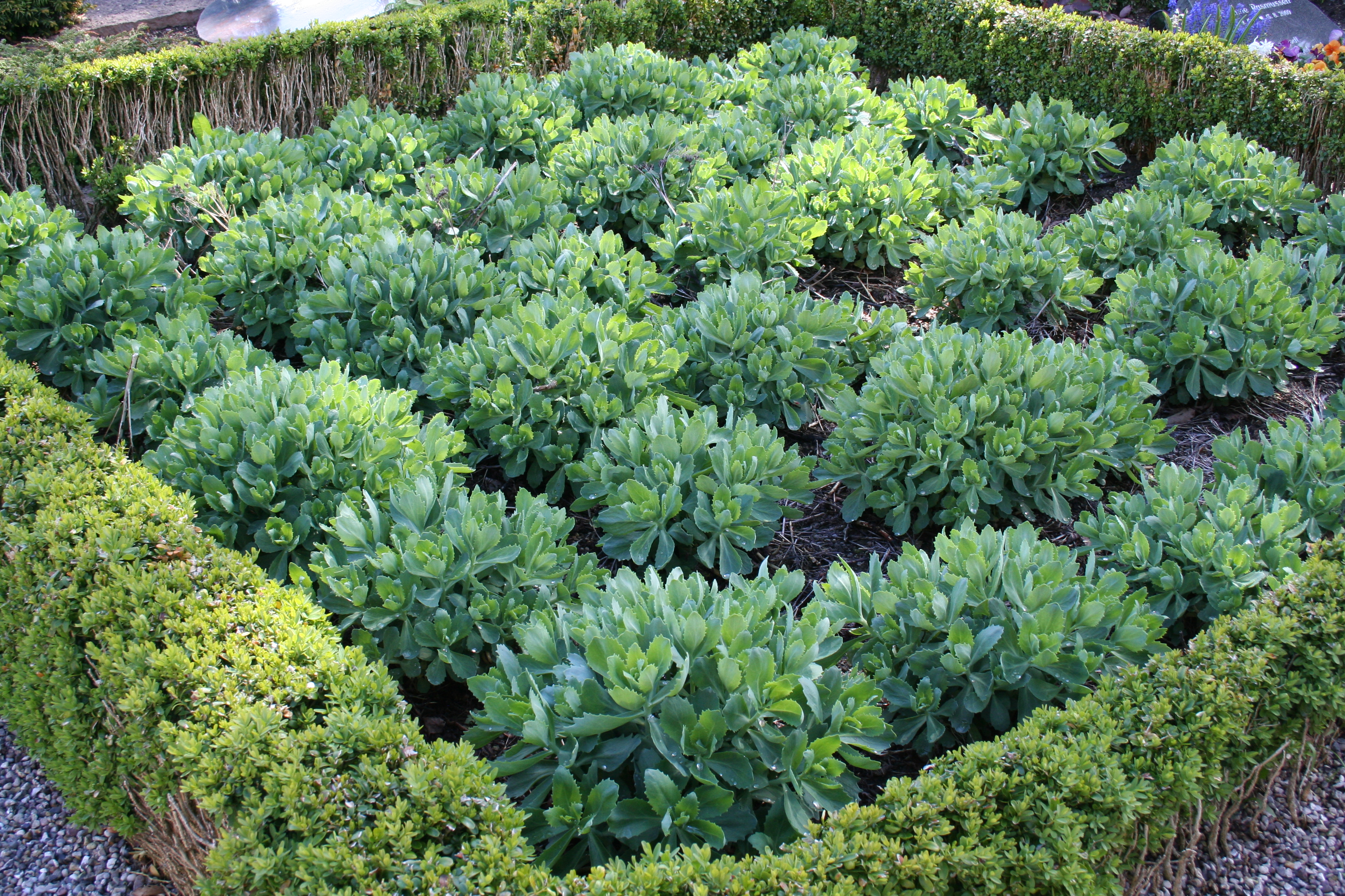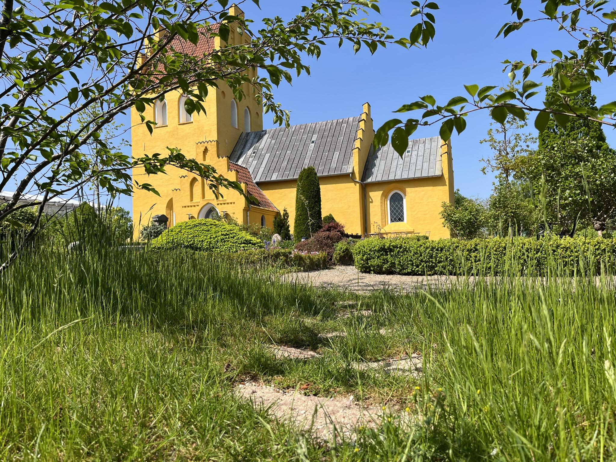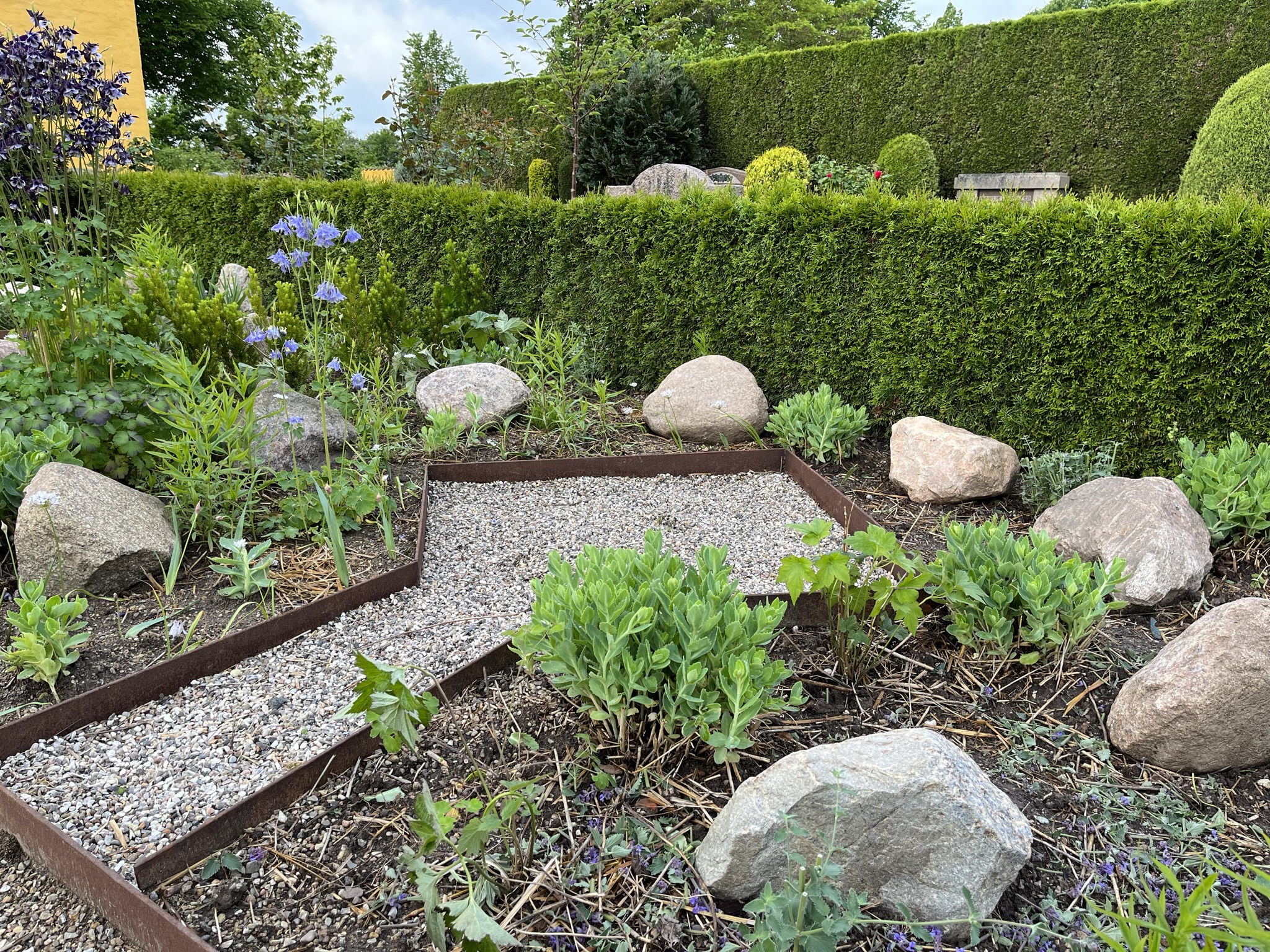 Frugthaven er tilplantet med gamle, lokale æblesorter. Og igennem de sidste mange år har vi plantet hundredevis af blomstrende stauder i de tomme, store grave, så vi bevarer kirkegårdens struktur.